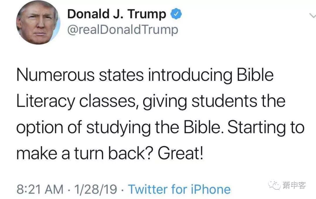 英文参考 :https://www.washingtonpost.com/amphtml/politics/trump-gives-his-blessing-to-allowing-states-to-teach-bible-literacy-in-public-schools/2019/01/28/50c1593c-22eb-11e9-ad53-824486280311_story.html?__twitter_impression=true&from=singlemessage&isappinstalled=0