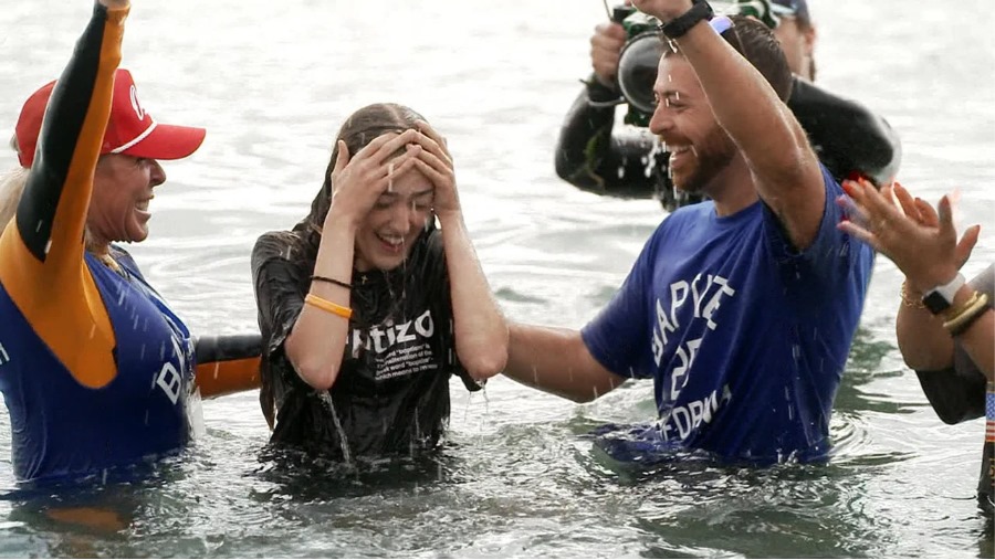 “Water baptism is identifying in the death, the burial, in the resurrection of Jesus Christ,” said Pastor Mark Francey of Oceans Church, a non-denominational Christian church in Orange County. “Getting in the ocean to do something so transcendent in a transcendent place like the ocean, it’s just a really special way to connect with God.”