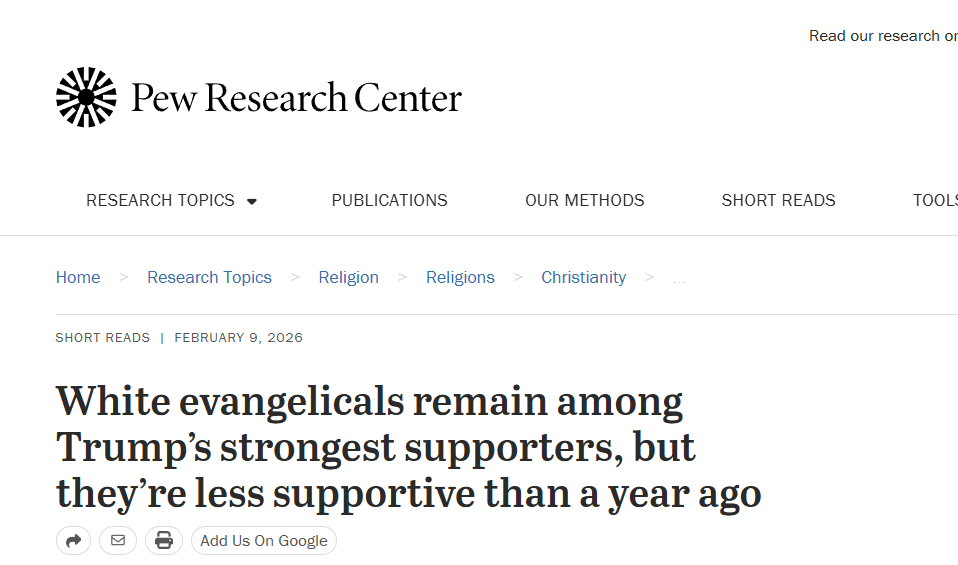 For instance, there has been an 8-percentage point drop since early 2025 in the share of White evangelicals who support all or most of Trump’s plans and policies. And there has been a 15-point drop in the share who are confident Trump acts ethically in office.